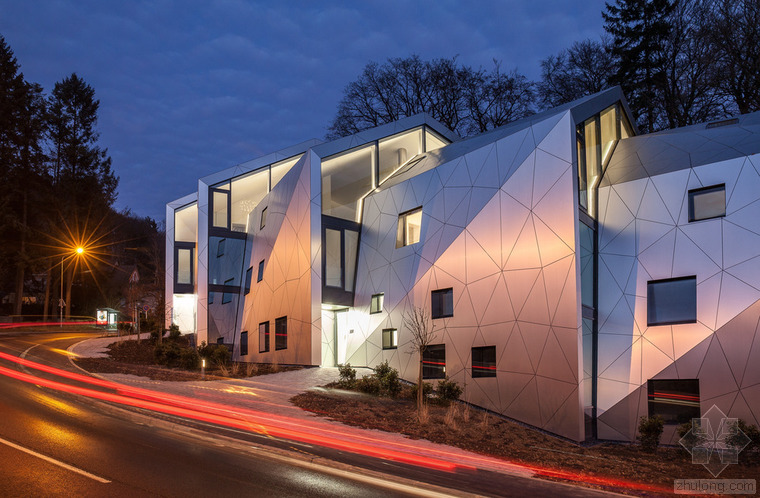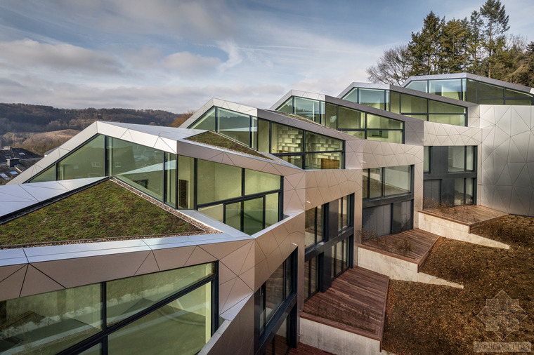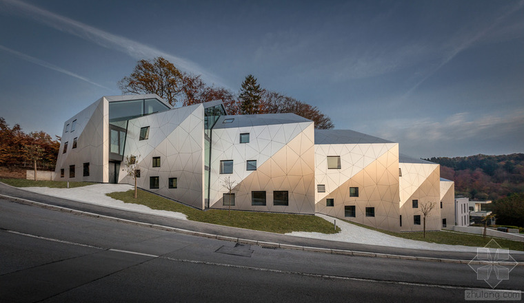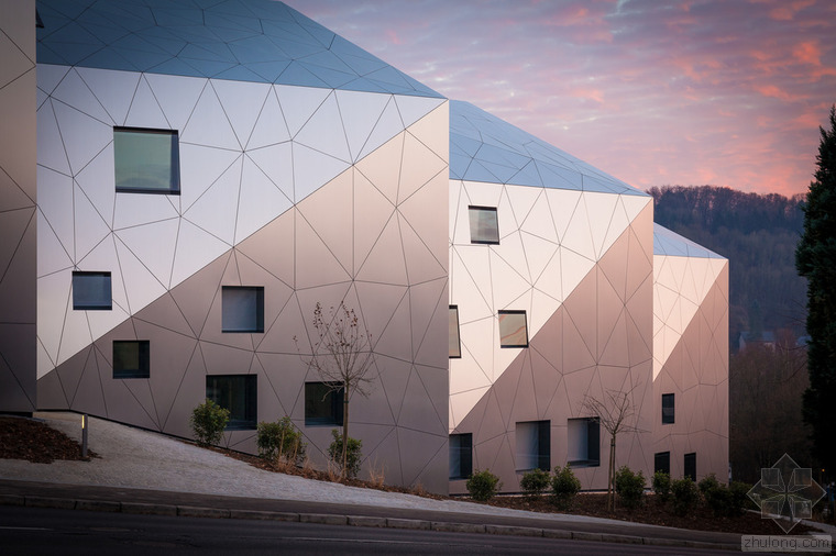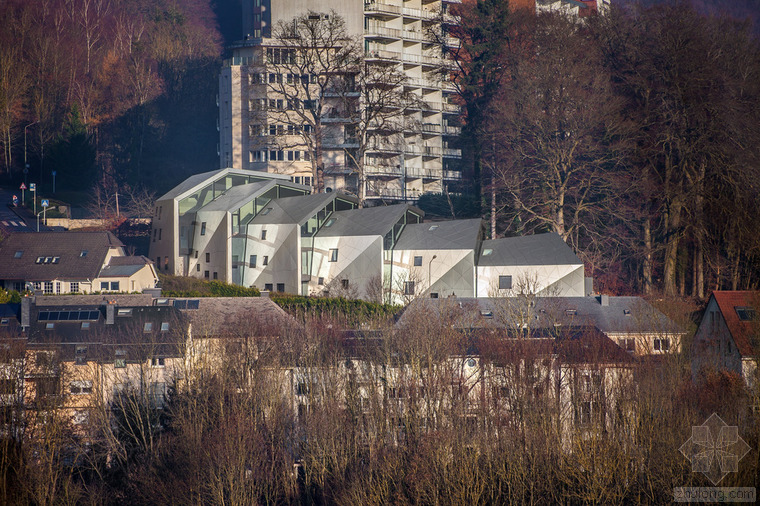 根據(jù)城市建筑規(guī)章條例規(guī)范,無論地形有多奇怪,都可以建造簡易的兩層單體建筑,并且?guī)в械叵率摇5牵車沫h(huán)境、特殊的地形條件和基地的形式造就了各種各樣的建筑,與此同時也產(chǎn)生了上文所指出的問題。基地位于一條十分彎曲的街道邊緣;地形高差達10米,非常陡峭;基地上保留有樹齡300年的古樹,且被列為國家歷史文物。所有的這些狀況使建筑有了最初的形狀。此外,該建筑還呼應(yīng)了特殊的城市環(huán)境(一邊是小體量的住宅單元,而另一邊是大體量的公寓樓。)建筑師通過將主體分成六個小的、垂直位移的體塊,創(chuàng)造了一個巧妙地轉(zhuǎn)變。建筑通過這種方法適應(yīng)了環(huán)境,既保持了所需的密度,又賦予其歸屬感、特性和人性化。體塊的分割和位移需要謹(jǐn)慎地研究自然采光的需求、朝向城市景觀的開闊視野,并且創(chuàng)造天地之間的視覺連接,同時還要保護住戶的隱私。