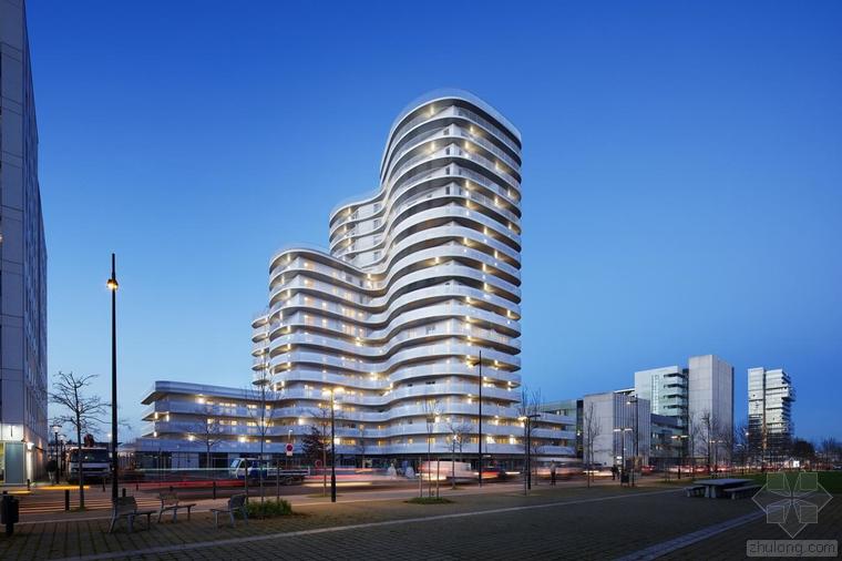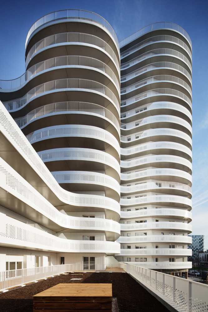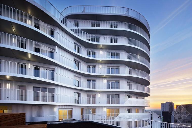 這是一棟建造于核心區(qū)位的獨特建筑。New’R大樓由流線型的折角和四周波浪起伏的陽臺構(gòu)成,這樣的造型設(shè)計不僅是在向奧斯卡•尼邁耶致敬,還是在向上世紀(jì)七十年代法國里維埃拉的建筑(例如由André Minangoy 和 Michel Marot設(shè)計的天使灣碼頭)致敬,最后還暗示了快樂主義者對邁阿密海灘的幻想。這座建筑顯得感性而又賦有多向性,其所在位置在“畢加索郵路”和目前沿鐵路基礎(chǔ)設(shè)施設(shè)置的、尚處于開發(fā)階段的新住區(qū)之間的重要節(jié)點上。New’R大樓對現(xiàn)有場地的構(gòu)建體現(xiàn)在對基地形成的環(huán)擁之勢和對新景觀的塑造。