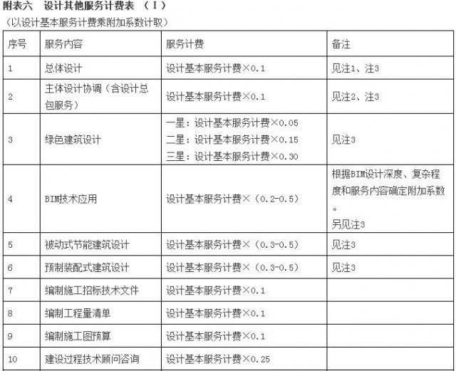 2.3 “設計其他服務”是指發(fā)包人要求設計人另行提供且發(fā)包人應當單獨支付費用的服務,包括:總體設計、主體設計協(xié)調(diào)(包括設計總包服務)、采用綠色建筑設計、應用BIM技術、采用被動式節(jié)能建筑設計、采用預制裝配式建筑設計、編制施工招標技術文件、編制工程量清單、編制施工圖預算、建設過程技術顧問咨詢、編制竣工圖、駐場服務;提供概念性規(guī)劃方案設計、概念性建筑方案設計、建筑總平面布置或者小區(qū)規(guī)劃方案設計、綠色建筑設計標識評價咨詢服務;提供室內(nèi)裝修設計、建筑智能化系統(tǒng)設計、幕墻深化設計、特殊照明設計、鋼結(jié)構(gòu)深化設計、金屬屋面設計、風景園林景觀設計、特殊聲學設計、室外工程設計、地(水)源熱泵設計等服務。其服務計費為“設計其他服務計費”。