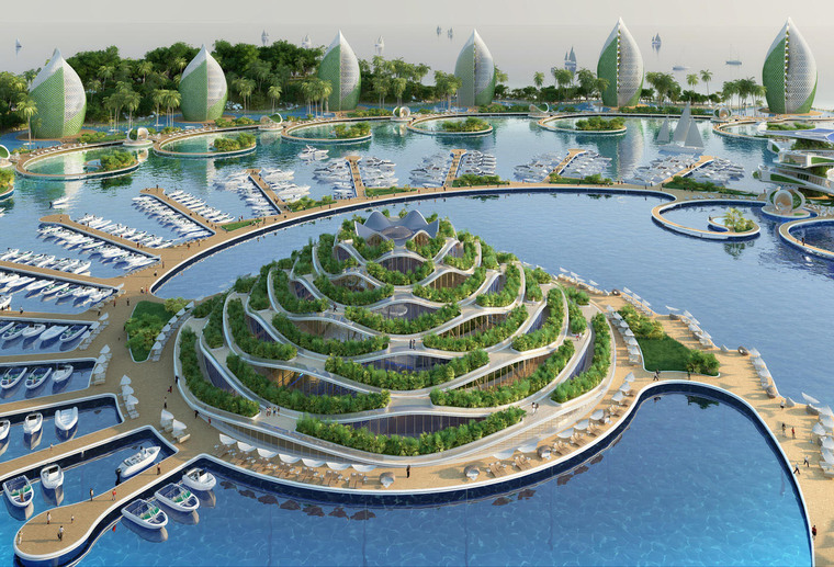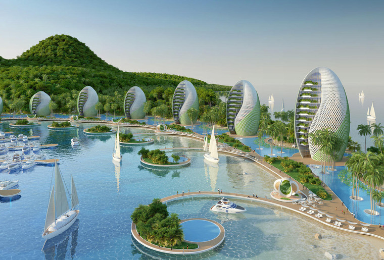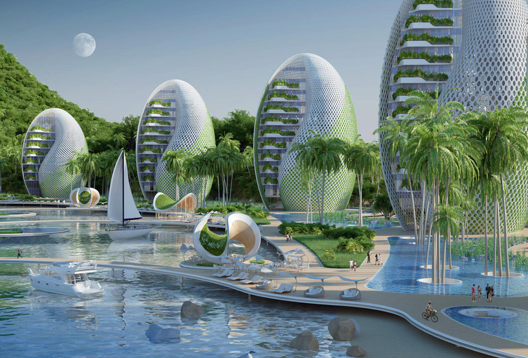 度假村廣泛使用“從源頭到源頭”的再利用方略和其他可持續(xù)設(shè)計策略,將本次方案設(shè)計成一系列螺旋形式的公寓樓和貝殼狀的旅館建筑,并將這些建筑按照兩條斐波納契螺線的旋轉(zhuǎn)軌跡排布于沿海環(huán)礁湖的岸邊。建筑群的中心是一座山形的綜合體,里面設(shè)置有學(xué)校、休閑游泳池、體育大廳、供度假村使用的廚房以及供環(huán)境科學(xué)家使用的整套實驗室用房。本次方案起名為“鸚鵡螺生態(tài)度假村”,生態(tài)設(shè)計是本次項目的主要側(cè)重點,Vincent Callebaut事務(wù)所精準(zhǔn)地指出對菲律賓群島構(gòu)成的環(huán)境威脅并以此作為設(shè)計靈感。方案中運用了各種各樣的可再生能源,包括潮汐能與太陽能,如果這些自產(chǎn)的能源在使用后還有結(jié)余,便會連接到地方電網(wǎng)并提供給社區(qū)。